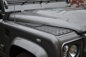 2mm Wing top chequer plate satin black powdercoat finish to fit all Defender models 1983-2016. The second photo shows them fitted, the plastic wing top vent sits on top of the chequer just like on genuine chequer plate kits, and the chequer plate stops short of the aerial so this can be used on both RHD and LHD models. It also looks fantastic too.