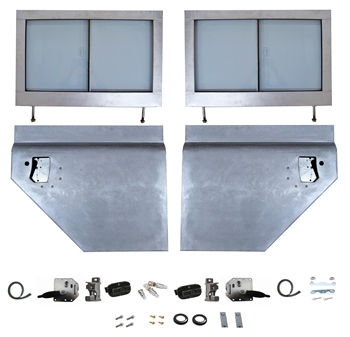 · Pair Of Fully Glazed 2nd Row Galvanised Door Tops · RH & LH Anti Burst Handles · RH & LH Strikers For Handles · 2 x Door Top To Bottom Seals · 3 x Barrel Lock & Key Set · 2 x Plastic latches · 2 x Lock hole surrounds · 2 x Series front door handle fixing kits · 4 x 3/8th dome head screws for the plastic latches · 4 x Captive Plates · 4 x M6x20mm flaged bolt In this kit, these are the only Series style defender door bottoms you will find in the world that are made specifically to convert all Defenders to the simpler and more robust Series split doors. These doors and tops are fully hot dip galvanised framed with aluminium skins as per factory spec. The threads on the door tops & pre-heat taped so no need to re tap them, they are ready to fit out of the box. Our bespoke doors bolt straight onto any Defender 90/ 110/ 130 1983- present and replicate all of the original functions your vehicle needs. No extra modification or welding is needed; these simply bolt onto you existing hinges! Benefits of converting to 2 part doors: 1. Much cheaper than new push button doors 2. Much simpler and less to go wrong as there is no winding window mechanism to go wrong! 3. These frames will not rot. 4. Lift up handles are much stronger against theft prevention as the lock design is stronger 5. Lift up handles are off-road safe as they do not protrude out of the door like the plastic push button handles do. 6. Much more elbow room inside the cabin 7. Removable door tops if you have a soft top or just wish to let more air in! |