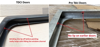 This is the superb and most sort after door which is made from a a single pressing frame as opposed to the earlier type of door which is made from multiple welded sections These are fitted to all 2006 onward Defenders as standard This can be retrofitted to earlier models with some minor modification. Unlike Puma front doors, your older style door card will fit to these puma 2nd row doors. All the other parts from your pre 2006 door can be reused, the internal window winder panel sometimes requires a couple of brackets making so it is supported fully though many of the mounts for this panel do line up so is just a matter of fitting what bolts you can and where needed add a few brackets to support the window winder panel. These really are the bees knees of doors and are very sort after and we have these at a fantastic price! On all Tdci style doors, around where the window sits, they have a lip pressed into the inner frame. This is unlike earlier doors which do not have this lip. This means fitting the window channel and spacers is very tight as the idea in manufacture was the window channel and spacers would be squeezed into place and the lip would keep all of the channel fixed into place to aid assembly of the door for mass production. However we find it is much better to just grind this lip off before painting using a flap disc in an angle grinder as it means once painted the window channel and spacers just simply slot into place like on earlier doors. It is very easy to do and only takes a few minutes per door so well worth doing before painting They come in a black primer so are ready to paint body colour. |